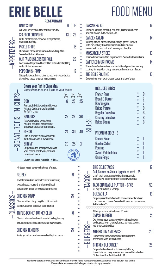 Like its namesake, The Erie Belle Restaurant enjoys a rich history in Kincardine. Owned by the same family for 34 years, the Edey family proudly acquired The Erie Belle in 2018. We look forward to continuing its tradition of serving delicious food in a friendly, welcoming atmosphere.